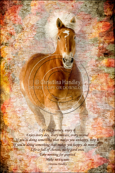 This is my Belgian mare Reba who I lost to Cancer on July 13, 2009 exactly one year earlier to the day that I received my Cancer diagnosis. Reba lived her entire life on our family farm and she was always full of life with lots of attitude. She graced the covers of numerous magazines and catalogs so it is only fitting that she grace the cover of this card.